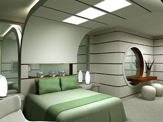 Kílaris criou uma peça única que concentra todos os elementos básicos do dormitório. Valorizando as linhas curvas, paredes e o teto foram unificados tornando-se um elemento só, sem cantos e junções. A idéia é "deixar fluir as energias positivas", conta o arquiteto.